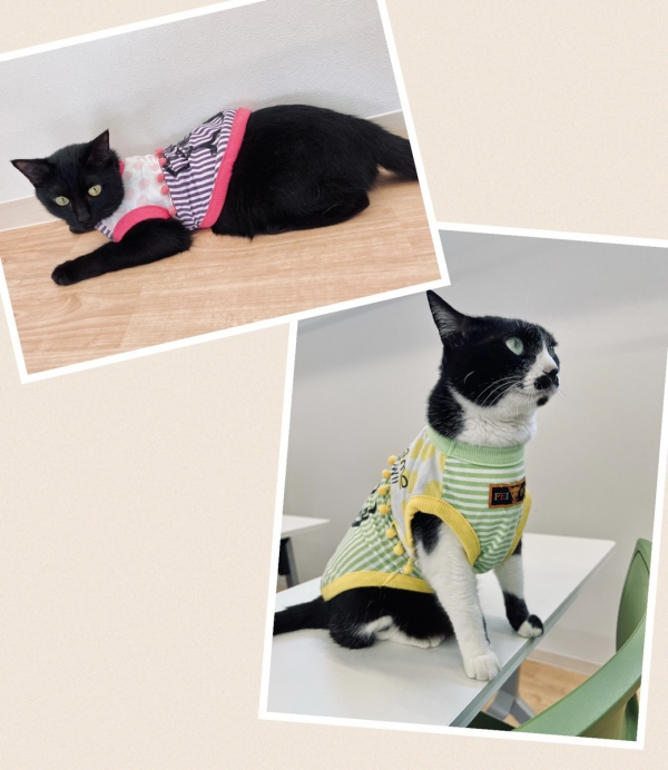 【えだまめ】【うに】以前、院内掃除をしていた際に、使われていなかったどこか懐かしい(?)わんちゃん用の服を発見👀✨うちのわんこ達には小さそうだったので、にゃんこ達に着てもらいました🐈⬛🌼……意外と似合っている&大人しく着てくれる2匹😊💕でも実はちょっと嫌そーう🌀な顔をしていたうにと、お腹部分が微妙にパツパツ💦なえだまめなのでした…😅🌱